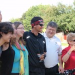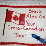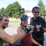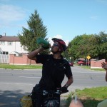We were actually an hour ahead of schedule for the arrival so we hung around in a park before the last kilometer. The welcoming party was out in full force waiting for me on the side of the road with signs in hand. I had been thinking about that moment for at least a month now at it could not have been better. Well.. except for the traffic lights that forced us to stop at the intersection that was only 150 metres from the finish line. Green light! Cameras in hand, we rolled in to meet the welcoming party. I was a nervous wreck, shaking and hugging my family. Out comes the champagne, fantastic!